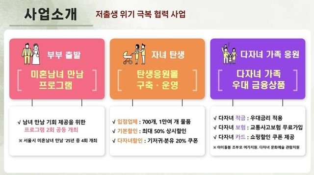서울시와 신한금융의 협력사업은 크게 3개 분야다. ①'결혼출발' 미혼남녀 만남기회 제공을 위한 공동 프로그램 개최 ②'자녀탄생' 육아용품 특화 할인몰 ‘탄생응원몰’ 개설·활성화 ③'다자녀가족 응원' 우대 카드·금융상품 출시 및 이벤트 개최로, 30만여 명의 시민들에게 혜택이 돌아갈 수 있을 것으로 전망된다.