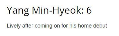 무난했다는 뜻이다. 교체로 들어간 선수가 6점 받기가 쉽지 않다. 양민혁은 24분 남짓 뛰면서 가능성을 선보였따.