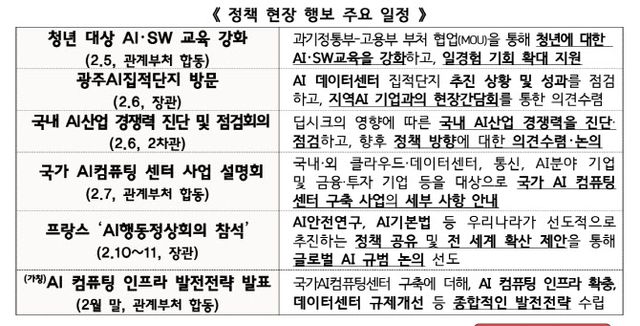 이달에만 △관계부처 합동 청년 간담회 △AI 컴퓨팅 인프라 현장 방문 및 발전방안 모색 △프랑스 ‘AI행동정상회의’ 참석을 통한 글로벌 AI규범 논의 주도 △AI기본법 하위법령 논의를 위한 간담회 등의 현장 행보가 줄줄이 예정돼 있다. 다음달에도 ‘AI·데이터 활용을 통한 문제 해결 민생현장 방문’ 등 연속적으로 민간과의 현장 소통을 강화하고, 정책 추진과정에 반영해나갈 예정이다.