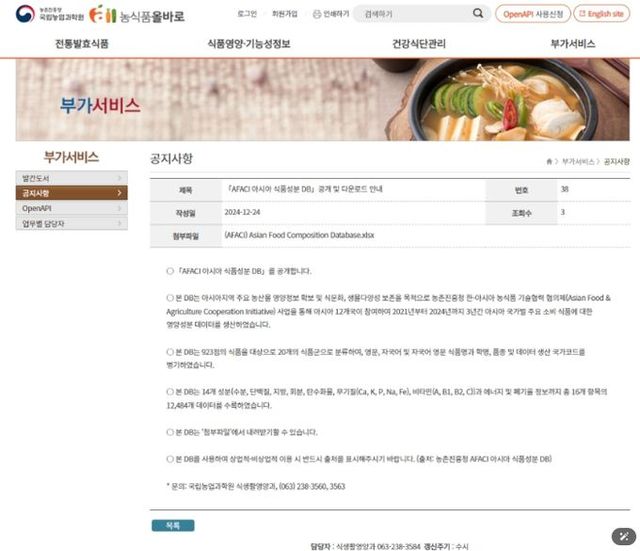 [와이뉴스] 농촌진흥청은 한-아시아 농식품 기술협력 협의체(Asian Food & Agriculture Cooperation Initiative) 회원국의 주요 소비 식품 영양성분 정보를 생산해 식품성분 데이터베이스를 구축하고 지난해 12월부터 농식품올바로(koreanfood.rda.go.kr) 누리집에서 공개했다.