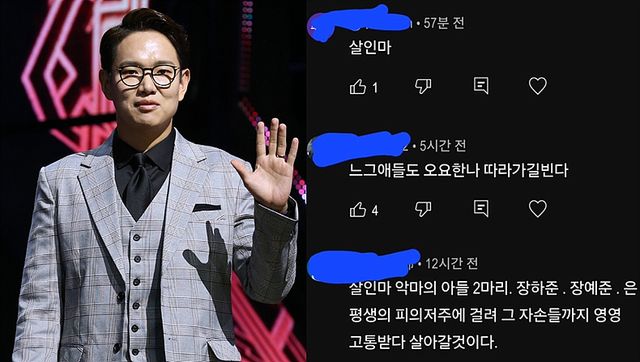 그는 글과 함께 자신을 향한 누리꾼들의 악성 댓글을 일부 공개했다. “살인마” “너네 애들도 오요안나 따라가길 빈다” “살인마 악마의 아들 2마리는 평생의 피의 저주에 걸려 그 자손들까지 영영 고통받다 살아갈 것이다” 등 장성규의 아들 실명까지 거론하는 댓글도 있었다.
