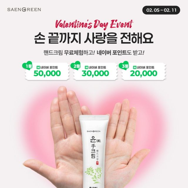 자연성 한방화장품 브랜드 생그린이 발렌타인데이를 맞아 '발렌타인데이, 손끝까지 사랑을 전해요' 무료체험 이벤트를 진행한다.