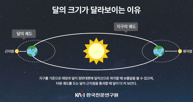 정월대보름이나 한가위의 보름달이 가장 크게 보일 것으로 생각하는 경우가 많지만, 실제 크기는 달의 공전 궤도에 따라 달라진다. 달이 타원형 궤도를 따라 움직이면서 근지점을 통과할 때는 더 커 보이고, 원지점을 지날 때는 상대적으로 작게 보인다.