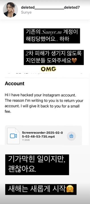 5일 선예는 새 계정을 만들고 "기존의 계정이 해킹당했다"며 "2차 피해가 생기지 않도록 지인분들 도와주세요"라는 글을 게재했다.