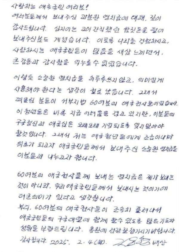 그는 “이들이 비록 지금 어려움을 겪고 있지만, 이들의 구국정신과 애국심은 오래도록 기억될 것”이라며 “애국 국민들이 보내주신 소중한 영치금을 이들과 나누고자 한다”고 말했다.