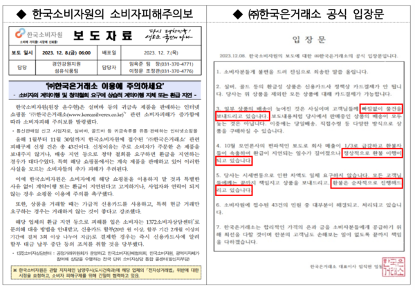 한국소비자원의 소비자피해주의보 발령, 한국은거래소 공식 입장문 /공정거래위원회