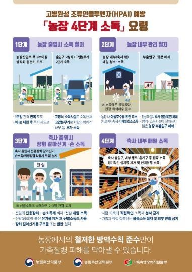 중수본은 바이러스 접촉 가능성이 있는 철새도래지 등 출입을 삼가고, 농장 출입 차량 2단계 소독(고정식소독기 및 고압분무기 소독), 계란 운반차량의 농장 내 진입 금지, 축사 출입 전 전용 장화 갈아신기, 기계·장비 등을 축사 내 반입 시 세척 및 소독조치 등 기본적인 방역수칙을 철저히 준수해 줄 것을 강조했다.