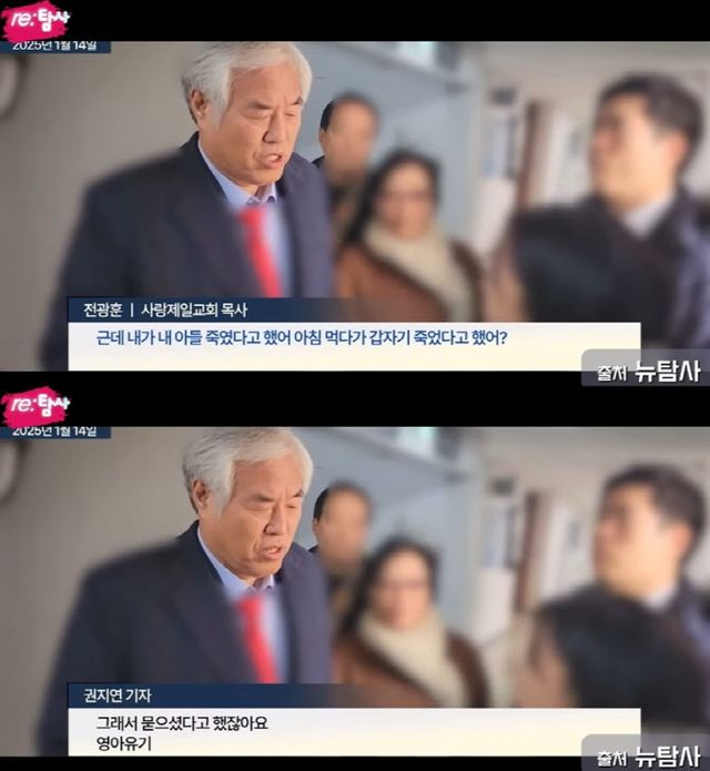전 목사의 발언이 다시 소환된 것은 지난달 29일 유튜브 채널 ‘re:탐사’에 게재된 영상 때문이다. 해당 영상엔 전 목사가 한 기자를 향해 “내가 왜 (당신) 전화를 안 받냐면, (당신이) 내가 내 아들을 죽였다고 그때 검찰에 고발하지 않았냐”고 따져 묻는 장면이 담겼다.