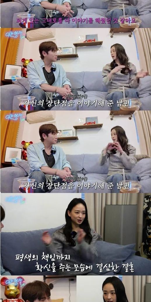 결혼을 결심한 계기에 대해서는 "남편이 진짜 확신이 있어 보였다. '얘랑 결혼하면 잘 살거 같고 얘랑 해야겠다'라는 확신이 있으니까 어떻게 저렇게 확신을 가질 수 있지가 궁금했고 있는 그대로를 다 이야기 해줬다. 더 잘보이려고 하는 게 아니라 이런 단점이 있고 이런 정점이 있는데 나는 이런 건 평생 책임질 수 있다 이런 걸 말해주는 게 되게 멋있었다"라고 답했다.