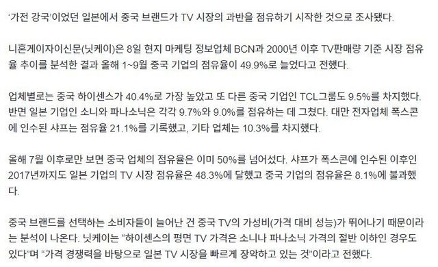 중국 하이센스하고 TCL이 일본 TV시장 절반이상 먹음
