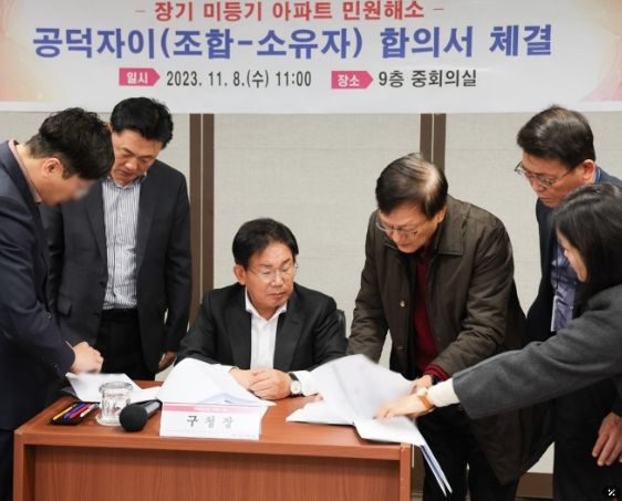 | ▲ 2023년 11월 8일, 마포구청 중회의실에서 공덕자이아파트 등기를 위한 합의서 체결이 진행됐다 |
