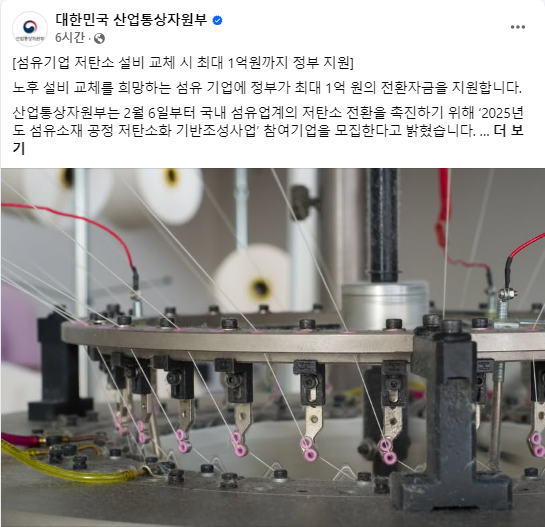 산업통상자원부는 오는 6일부터 국내 섬유업계의 저탄소 전환을 촉진하기 위한 '섬유소재 공정 저탄소화 기반조성사업'의 참여기업을 모집한다고 밝혔다.