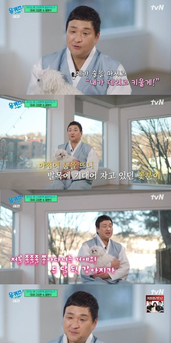 이날 구성환은 반려견 꽃분이와 첫 만남에 대해 "꽃분이는 저의 분신 같은 존재다. 꽃분이와 저의 인연은 아는 친구 집에서 강아지 알레르기가 있다 보니 이 강아지를 어쩔 수 없이 돌려보내야 된느데 어떻게 하지?' 했는데 제가 사실 그때 강아지를 키울 여건이 안 됐다"라며 회상했다.