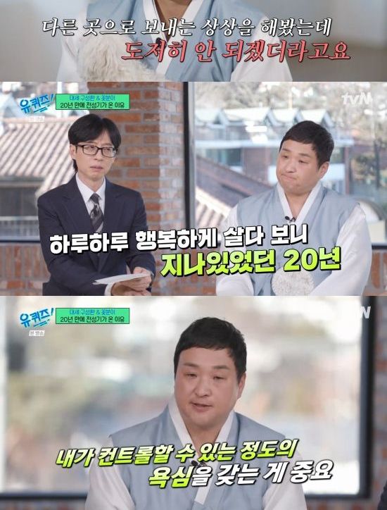구성환은 "즐겁게 했다. 버틴다고 했으면 20년 동안 이 일을 즐겁게 할 수 있었을까? 절대 못 했을 거라고 생각한다. 나이가 들면서 내려놔야겠다고 생각한 게 시기, 질투, 욕심 없는 걸 배워가자고 생각한다"라며 털어놨다.