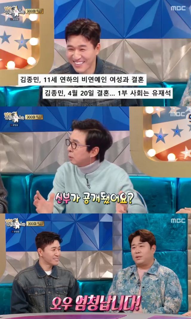 이날 김구라는 “이번에 굵직한 근황이 생긴 것 축하한다”며 김종민의 결혼을 축하했다. 그러자 김국진은 “결혼을 하냐”고 놀라며 “신부가 공개가 됐냐”고 물었다. 이에 김종민은 “공개가 안됐다. 비연예인”이라고 설명했고, 문세윤은 “제가 사진 보고 통화도 했는데 엄청 나다”고 말했다.