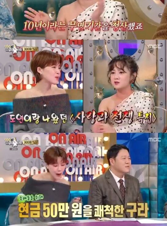 박나래는 "그 시점으로 10년 무명 시절을 청산했다. 그 다음해 2월에 장도연, 양세형, 양세찬과 함께 '사랑과 전쟁' 특집으로 나왔었다. 그 때 구라 선배님이 우리가 너무 재밌다고 현금으로 50만원을 주셨다. 너무 좋았었다"고 말했다.