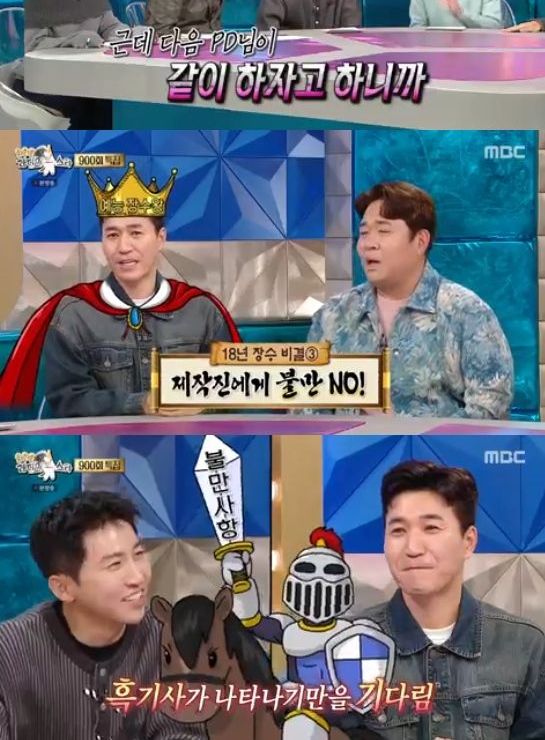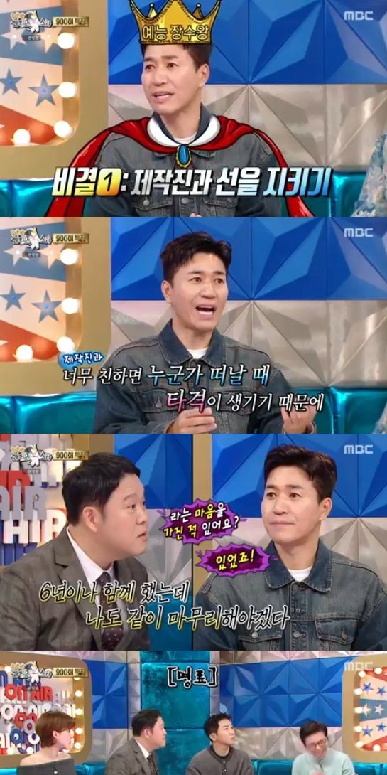김종민은 오래 살아남은 비결에 대해 "제작진과의 선을 잘 지켜서 그런 것 같다. 시즌2 때 승우 형이 갑자기 나간다는거다. PD와 너무 친해서 PD가 떠나자 같이 하차를 하더라. 그래서 제작진과 선을 지킨다"면서 웃었다.