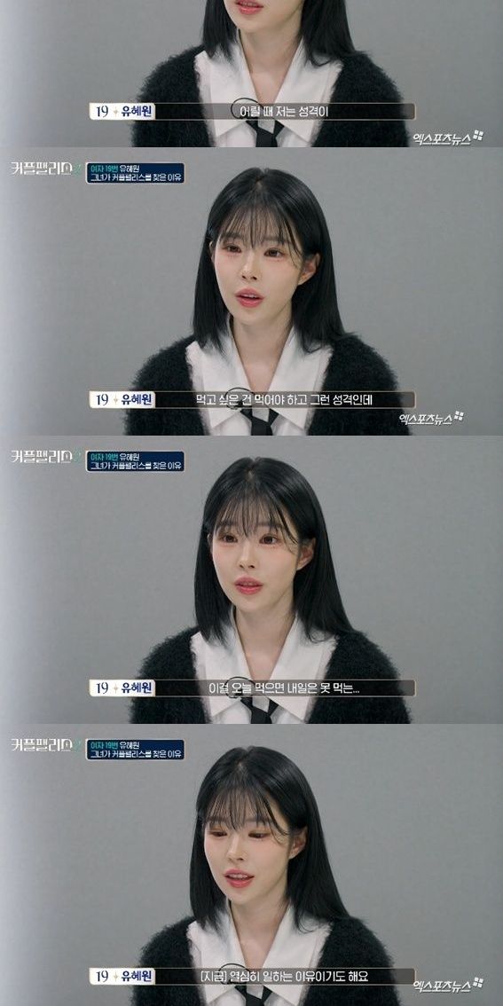 유혜원은 "95년생 유혜원이다. 엄마와 저와 여동생 이렇게 가족이 셋이다.아빠가 계시지 않아서 그 역할을 내가 최대한 노력하는 K 장녀다. 어릴 때 성격이 먹고 싶은 건 먹어야 하고 그런 성격인데 이걸 오늘 먹으면 낼 못 먹는 게 슬픈 거다. 그래서 열심히 일하는 이유이기도 하다"라고 털어놓았다.