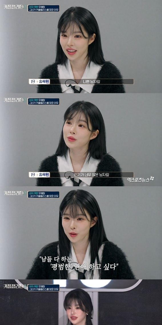 유혜원은 "나쁜 남자와 인기가 너무 많은 남자와 그 정도"라며 "남들 다 하는 평범한 연애를 하고 싶다"라고 바랐다.