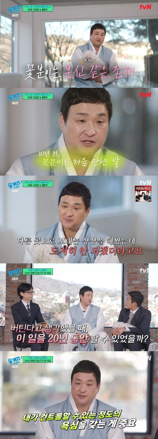 이날 구성환은 반려견 꽃분이와 첫 만남을 회상했고, "꽃분이는 저의 분신 같은 존재다. 꽃분이와 저의 인연은 아는 친구 집에서 강아지 알레르기가 있다 보니 이 강아지를 어쩔 수 없이 돌려보내야 된느데 어떻게 하지?' 했는데 제가 사실 그때 강아지를 키울 여건이 안 됐다"라며 밝혔다.