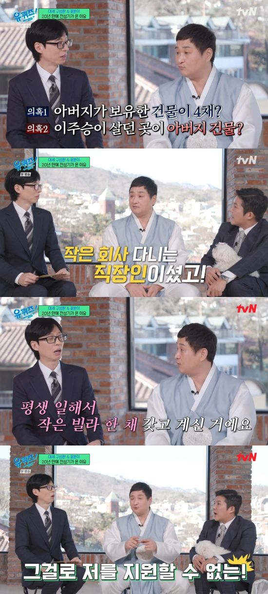 구성환은 "제일 황당했던 댓글이 우리 아버지가 건물 빌딩 조그마한 게 4채를 갖고 계시고 주승이가 그전에 살았던 빌라도 저희 아버지 건물이고 그런 이야기가 있더라"라며 의아해했다.
