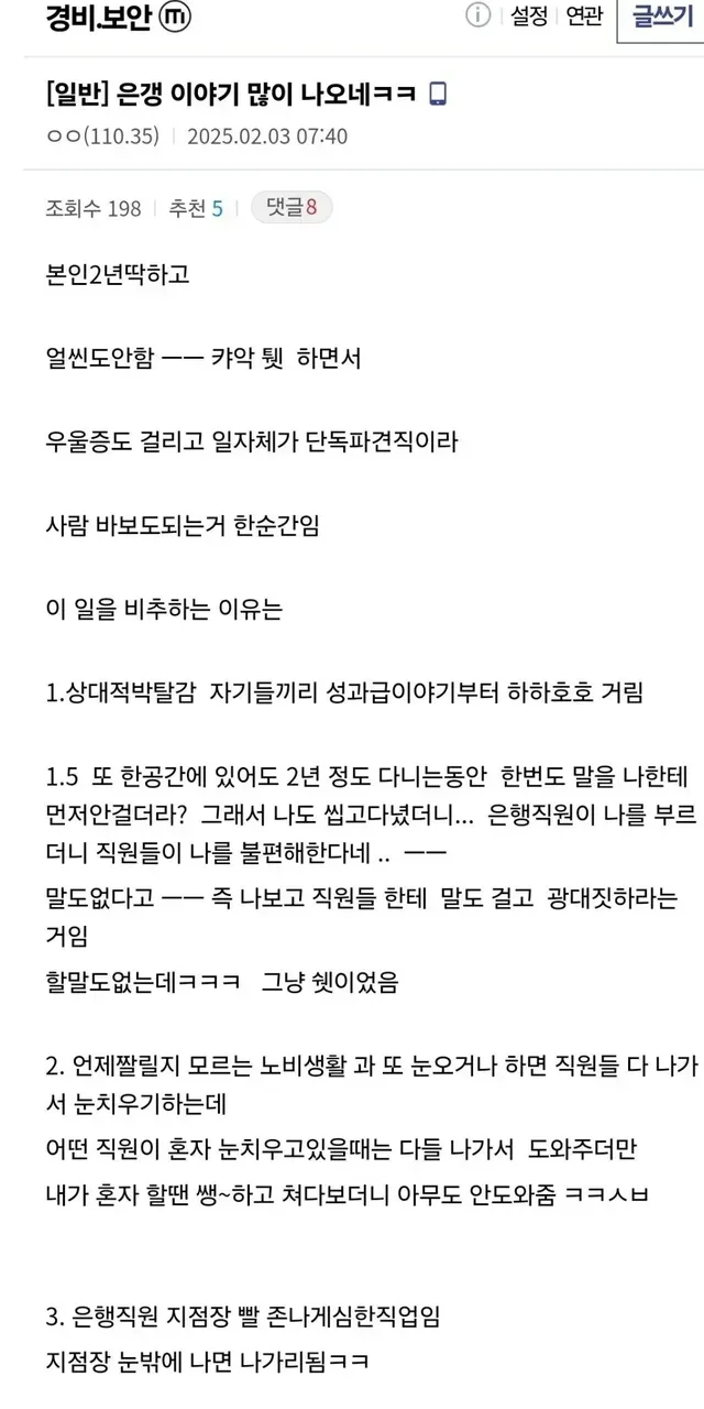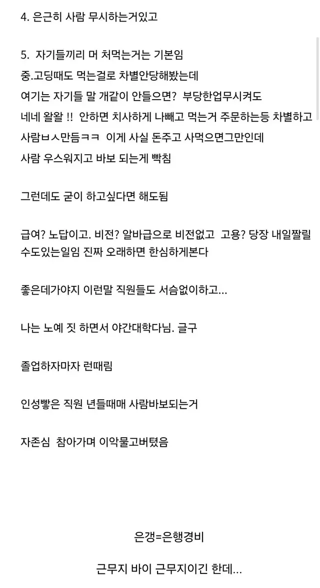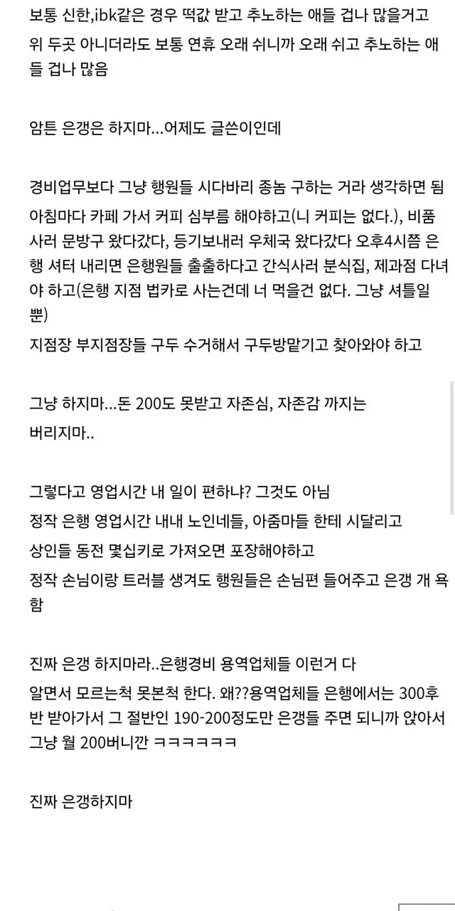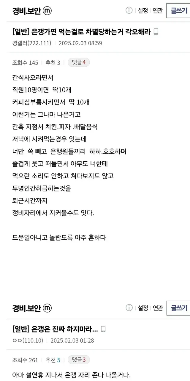 먹는걸로 차별 당한다는 은행경비 근무 후기들,,