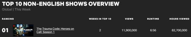 글로벌 성적 역시 화려한 기록을 쓰고 있다. 넷플릭스 톱 10 공식 사이트에 따르면 ‘중증외상센터’는 지난 1월 27일부터 2월 2일까지 1190만 시청 수를 기록하며 공개 2주차에 글로벌 TV쇼 비영어부문 1위에 올랐다.