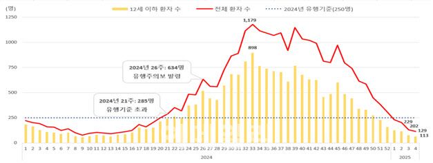 병원급 표본감시 의료기관의 마이코플라스마 폐렴균 감염증 입원환자 수는 지난해 8월 정점(1179명)을 보인 후 감소 추세를 보이다가 11월 이후 큰 폭으로 감소했다. 최근 (52주) 309명 → (2025년 1주) 229명 → (2주) 202명 → (3주) 129명 → (4주) 113명 등으로 4주 연속 유행기준 미만으로 떨어졌다.