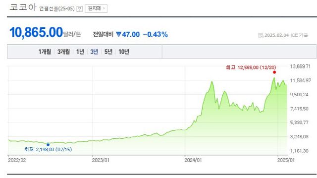 초콜릿 주 원료인 코코아는 시세 폭등 후 안정세를 찾지 못하고 있다. 지난해 12월 20일 기준 코코아 선물가격은 t당 1만 2565달러(ICE 선물거래소 기준)를 기록해 역대 최고치를 다시 한번 경신했다.