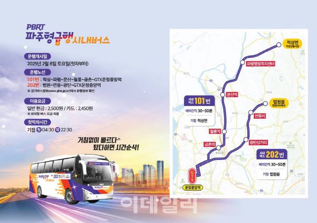 101번은 ‘적성~파평~문산~월롱~금촌~GTX 운정중앙역’을 잇는 노선으로 평일 기준 30회, 202번은 ‘법원~연풍~광탄~GTX 운정중앙역’ 구간을 하루 32회 운행한다.