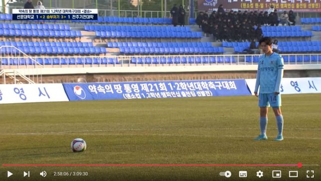 전민수의 이채로운 승부차기 장면은 SBS Sports 유튜브 채널 ‘선문대 vs 전주기전대’ 경기 풀영상 2시간 57분 45초 지점부터 보면 된다.