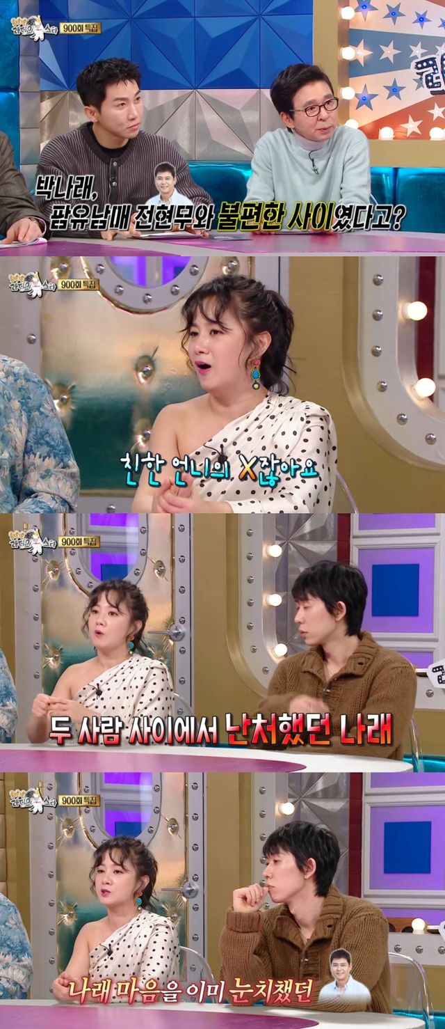 이때 김국진은 박나래에게 "전현무와 불편한 사이였다고 한다"라고 궁금증을 드러냈고, 박나래는 머뭇거리면서 "친한 언니의 X(전 남자친구)다. 언니랑 워낙 가깝게 지내는데, 방송에서 오빠랑 친한 모습을 보여주면 괜히 의리를 저버리는 것 같았다"고 털어놨다.