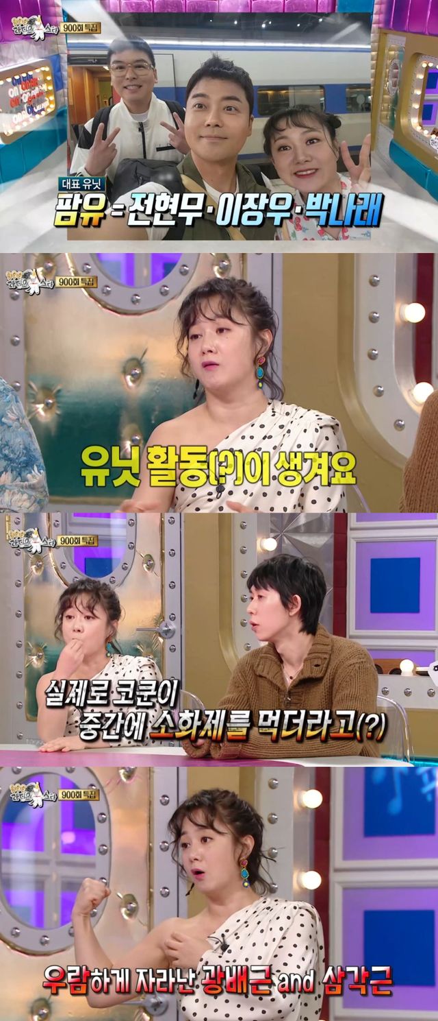 김구라는 "시작은 혼자였는데 지금은 부양가족이 있다는 게 무슨 말이냐"라고 물었고, 박나래는 "방송을 하다 보니까 유닛 활동이 생기더라"고 답하면서 맛깔나는 먹방과 보디프로필로 화제를 모은 '팜유'를 언급했다. 멤버는 박나래와 전현무, 이장우.