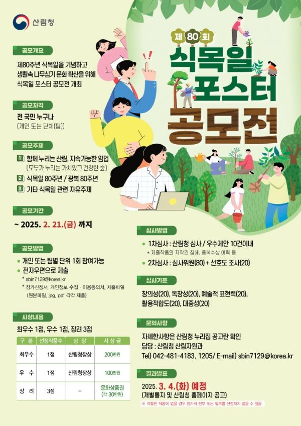 산림청은 ‘제80주년 식목일 기념 포스터 공모전’을 2월 21일까지 개최한다. 이번 공모전은 지난 80년의 역사 속에서 국민이 함께 가꿔온 숲의 가치를 널리 알리고 생활 속 나무심기 문화를 확산하기 위해 마련됐다.