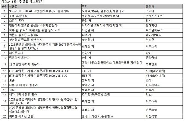 2025년 2월 첫째 주 예스24 종합 베스트셀러 순위에서 ‘STOP THE STEAL 대법원의 부정선거 은폐기록’이 1위를 차지했다. 네 명의 변호사가 공저한 이 책은 선거 부정과 관련한 논란을 다룬 정치 사회서로, 독자들의 큰 관심을 받고 있다.