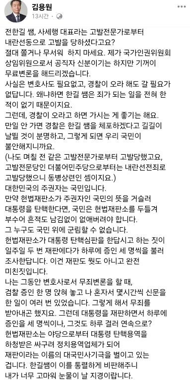 그는 "헌재는 야당으로부터 대통령 탄핵 용역을 하청받은 싸구려 정치용역업체가 돼 재판이라는 이름의 대국민 사기극을 벌이고 있다"며 "한길쌤이 이를 통렬하게 비판해주니 너무 고마워 눈물이 날 지경"이라고 덧붙였다.