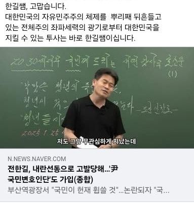 또 윤 대통령 탄핵 반대를 주장하는 한국사 '일타강사' 전한길씨가 최근 시민단체로부터 내란선동 등의 혐의로 고발당한 데 대해 "공직자 신분이기는 하지만 기꺼이 무료변론을 해드리겠다"며 "한길쌤은 죄가 되는 일을 전혀 한 적이 없기 때문"이라고 주장했다.