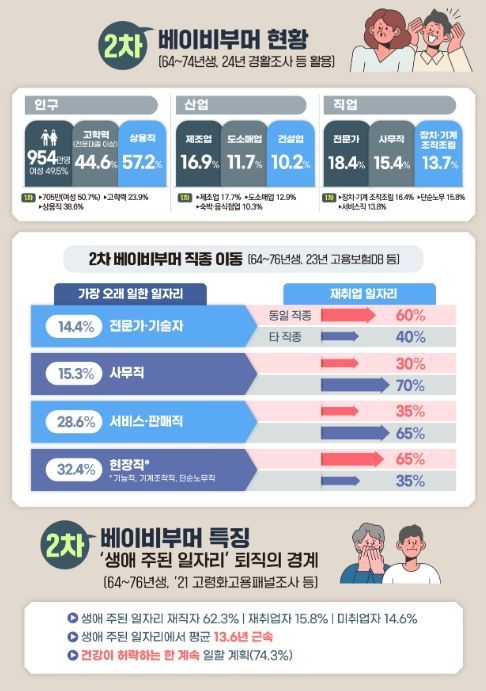 이번 간담회에서는 경험과 능력, 체력이 우수함에도 조기퇴직 등을 겪고 있는 약 1천만명의 50~60대(2차 베이비무머 1964년생~1974년생, 약 954만명)를 위한 ‘내 일’ 찾기 지원방안을 논의했다. 특히, 사무직·서비스직 등은 퇴직 후 다른 직종으로 옮기는 경우가 많아 경력전환형 재취업 사례를 중심으로 생생한 현장 의견을 들었다.