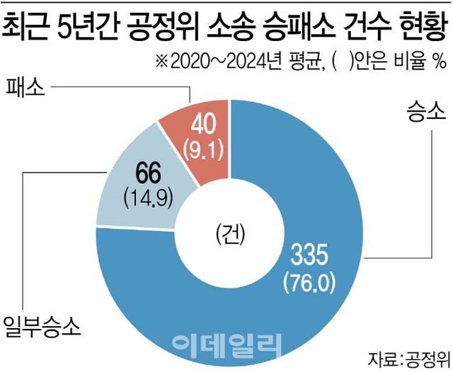 최근 5년 단위로 봤을 때 판결이 확정된 441건 소송 중 335건(76.0%)을 전부승소했다. 일부승소까지 포함하면 401건(90.9%)을 승소했다. 같은 기간 과징금 판결이 확정된 2조 3876억원 중 95.0%(2조 2674억원)에 대해 처분 적법성이 확정됐다.
