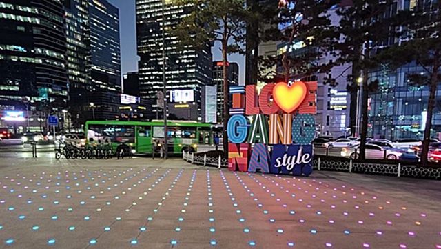 강남역 11번과 12번 출구 사이에 위치한 강남스퀘어 광장은 ‘가슴 뛰고 설레는 강남역’이라는 콘셉트로 새롭게 조성됐다. 가장 눈에 띄는 변화는 ‘I♡GANGNAM STYLE’ 조형물로, 높이 3.8m의 대형 구조물이 광장의 중심을 차지하고 있다. 조형물 아래 바닥에는 LED 조명이 설치돼 야간에도 독특한 분위기를 연출한다.