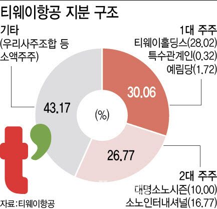 소노인터내셔널 측이 가처분 소송이라는 법적 대응까지 활용하면서 다음 달 티웨이항공 주총에서 이사회 자리 확보를 위한 치열한 표 대결이 예상된다. 현재 티웨이항공의 최대 주주는 티웨이홀딩스와 예림당으로 총 30.06% 지분을 소유하고 있다. 2대 주주인 대명소노그룹은 26.77%로 최대주주와 지분 격차는 3%포인트에 불과하다. 대명소노그룹은 지난해 사모펀드(PEF) 운용사 JKL파트너스로부터 티웨이항공 지분 26.77%를 약 1897억원에 사들였다.