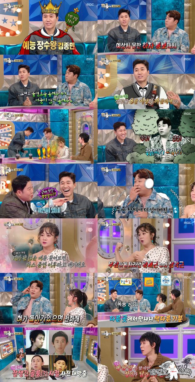 특히 김종민은 ‘라디오스타’에 11번 출연한 최다 출연자이자, ‘라디오스타’와 비슷한 시기 론칭된 ‘1박 2일’의 지박령으로 장수 비결을 전하며 큰 웃음을 안겼다. 18년이란 시간 동안 ‘1박 2일’을 지킨 그는 사실 자신이 그동안 하차 통보를 받기도 하고, ‘국민 청원’으로 하차 서명이 이뤄졌던 사실도 언급했다.