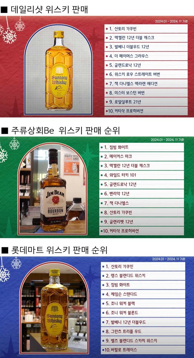 지난해 한국에선 어떤 위스키가 가장 많이 팔렸을까. 주류 전문가인 조승원 MBC 기자는 최근 일사에프 유튜브 채널에서 지난해 온·오프라인 주류 유통 플랫폼 3곳의 위스키 판매 순위를 소개한 바 있다. 위스키 유통 플랫폼 데일리샷, 주류상회Be, 롯데마트의 판매 순위 데이터를 바탕으로 2024년 가장 인기 있었던 위스키를 살펴본다.