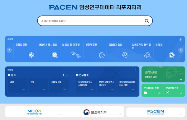 한국보건의료연구원 환자중심 의료기술 최적화 연구사업단은 올 1월 ‘환자중심 의료기술 최적화 연구사업(이하 PACEN) 임상연구데이터 리포지터리’를 구축하고 임상연구데이터 공개 및 분양을 개시했다고 밝혔다.