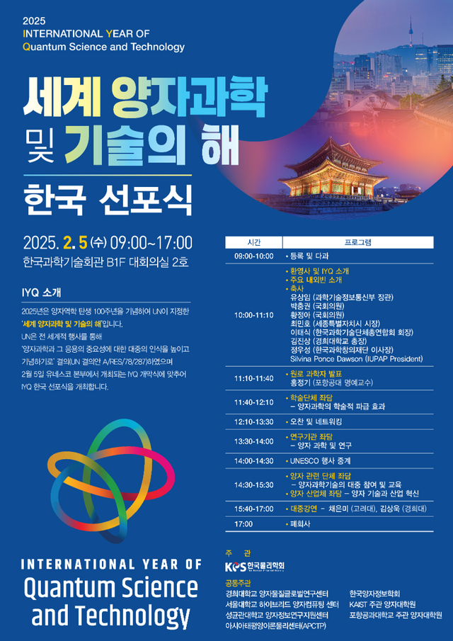 [한국대학신문 윤채빈 기자] 유엔(UN)이 2025년을 ‘세계 양자과학 및 기술의 해(IYQ)’로 지정한 가운데, 한국물리학회도 이에 발맞춰 지난 5일 한국과학기술회관에서 ‘IYQ 한국 선포식’을 개최했다.