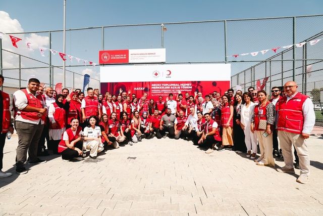 대한적십자사는 지진으로 큰 피해를 입은 튀르키예 6개 지역에 8개의 ‘지역사회서비스센터’를 건립했다. 사진은 2024년 8월 27일(화) 하타이주 젤부르츠(Guzelburc) 컨테이너 단지 내 위치한 지역사회서비스센터에서 참석자들이 기념촬영을 하는 모습(사진출처: 대한적십자사) |