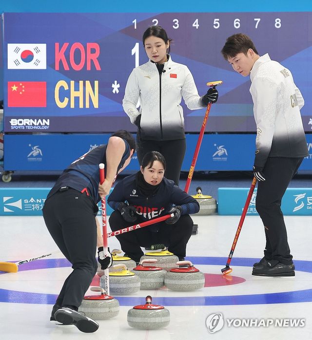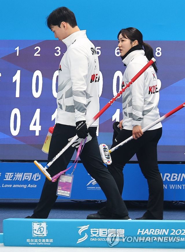 김경애(강릉시청)-성지훈(강원도청)으로 구성된 컬링 믹스 더블 대표팀은 6일 중국 하얼빈의 핑팡 컬링 아레나에서 열린 대회 라운드 로빈 B조 4차전에서 중국의 한위-왕즈위 조에 4-6으로 졌다.