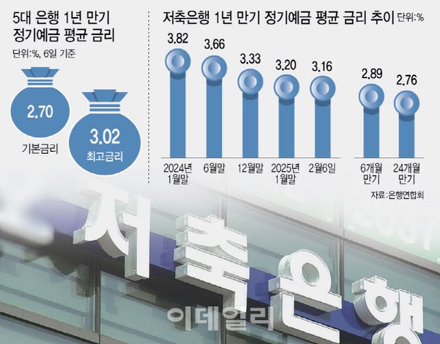 시중은행보다 낮은 금리를 제공하는 저축은행까지 등장했다. 지난해까지 전무했던 연 2%대 저축은행 정기예금 금리는 6개월, 24개월, 36개월 각각 2.91%, 2.78%, 2.74%로 내려앉았다. KB저축은행의 1년짜리 정기예금 금리는 연 2.8%였다. 예가람·하나·신한저축은행 금리도 연 2.9%다. 이날 기준 저축은행의 12개월 만기 정기예금 평균 금리는 3.16%로 집계됐다. 한 달 전(3.32%)보다 0.16%포인트, 1년 전(3.80%)과 비교하면 0.64%포인트 하락했다.