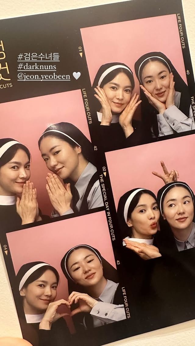 공개된 사진에는 전여빈과 즉석 사진을 찍으며 즐거운 시간을 보내는 송혜교의 모습이 담겼다. 두 사람은 수녀 복장을 한 채 기도하는 포즈를 취하는가 하면, 서로를 끌어안은 채 화기애애한 분위기를 뽐냈다.