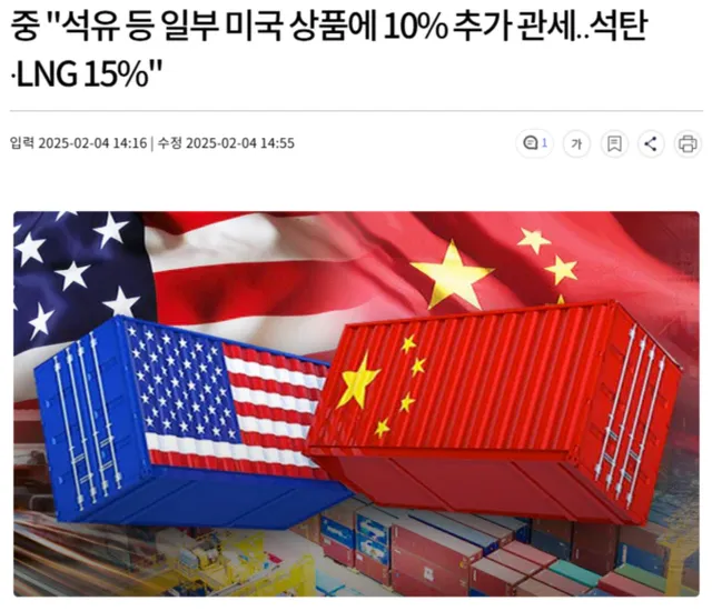 중 "석유 등 일부 미국 상품에 10% 추가 관세.. 석탄·LNG 15%"